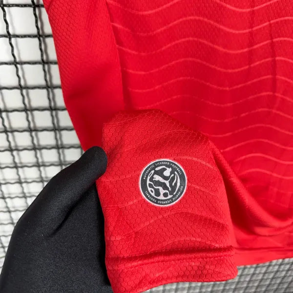 Modelo na tradicional cor vermelha com detalhes em verde, trazendo um visual moderno e elegante. Ideal para quem é fã de futebol e quer representar com estilo.