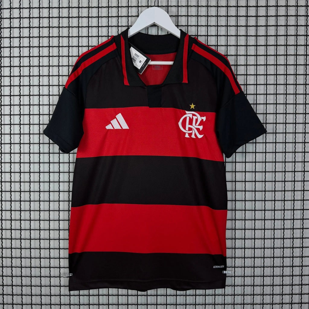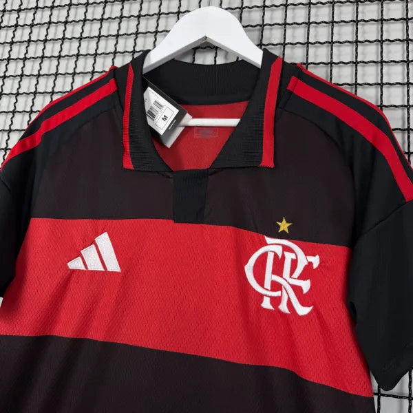 Camisa do Mengão I 2026. Confeccionada em poliéster reciclado com tecnologia de absorção de suor. Gola polo clássica, escudo bordado no peito e corte regular confortável. Tecido leve e respirável, ideal para jogos no estádio ou uso no dia a dia.